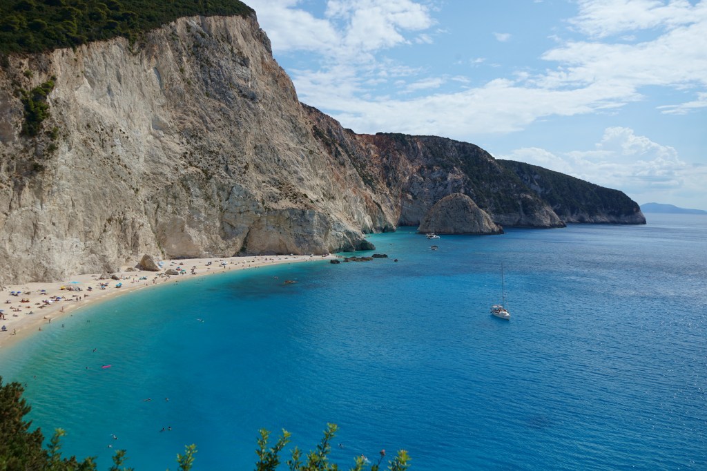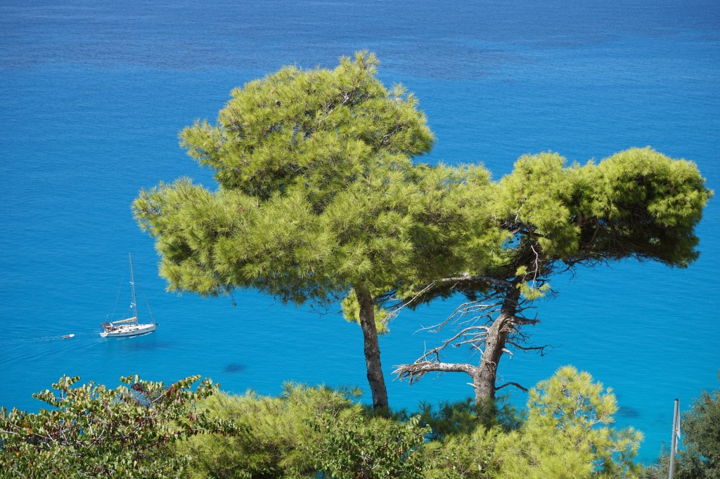 Most of the Lefkada beaches are difficult to reach. Wild vegetation and steep cliffs separate the villages from the waters below. Glimpses from above feel like a drone view of perfectly colored blue and turquoise below.