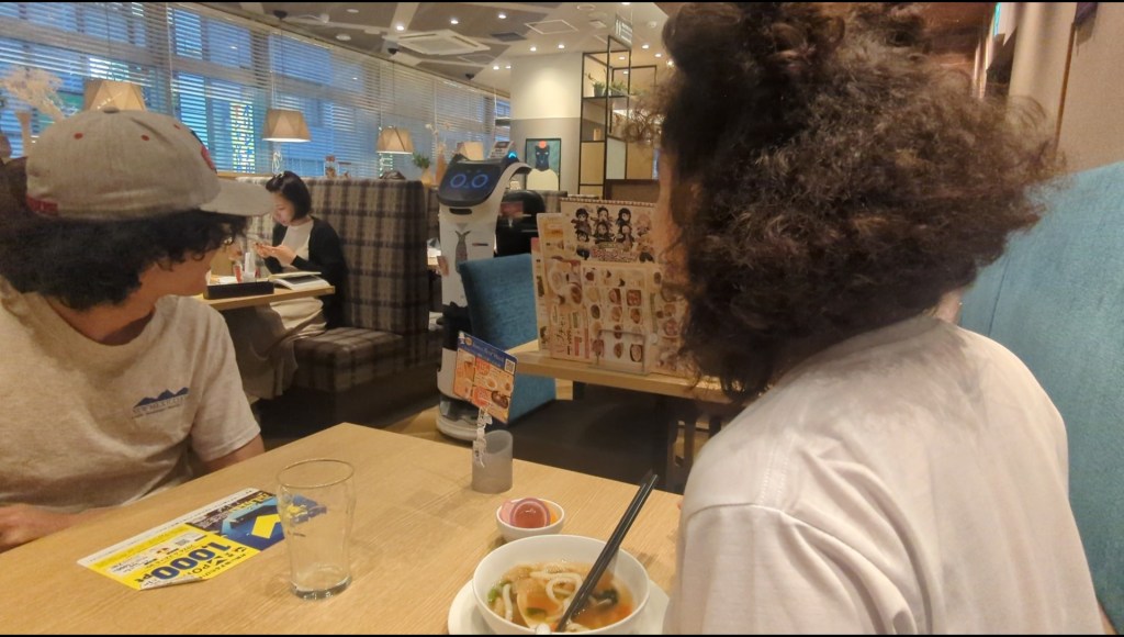 At dinner nearby, I notice the tables next to us are full of young men playing with their anime figures while they chat with their friends. We order from an iPad at our table and the food is delivered by a robot. After the robot gives us the check, we pay by scanning our receipt and putting bills into a machine. The next day we eat at a Dragon Quest fantasy restaurant where the food is shaped like characters from the Dragon Quest series.